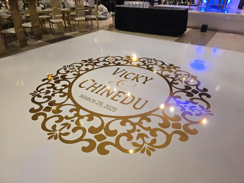Custom Decal Dance Floor Wrap Gloss White Removable Vinyl with Gold Printed Monogram Logo Design in The Center – Wedding Sticker Print Wrap