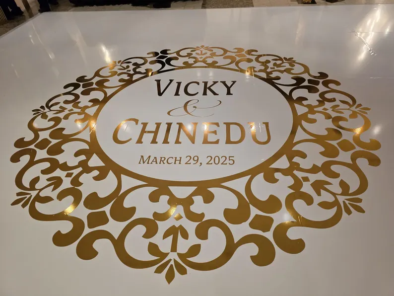 Custom Decal Dance Floor Wrap Gloss White Removable Vinyl with Metallic Shiny Chrome Gold Foil Monogram Logo Design in Center for Wedding quantity
