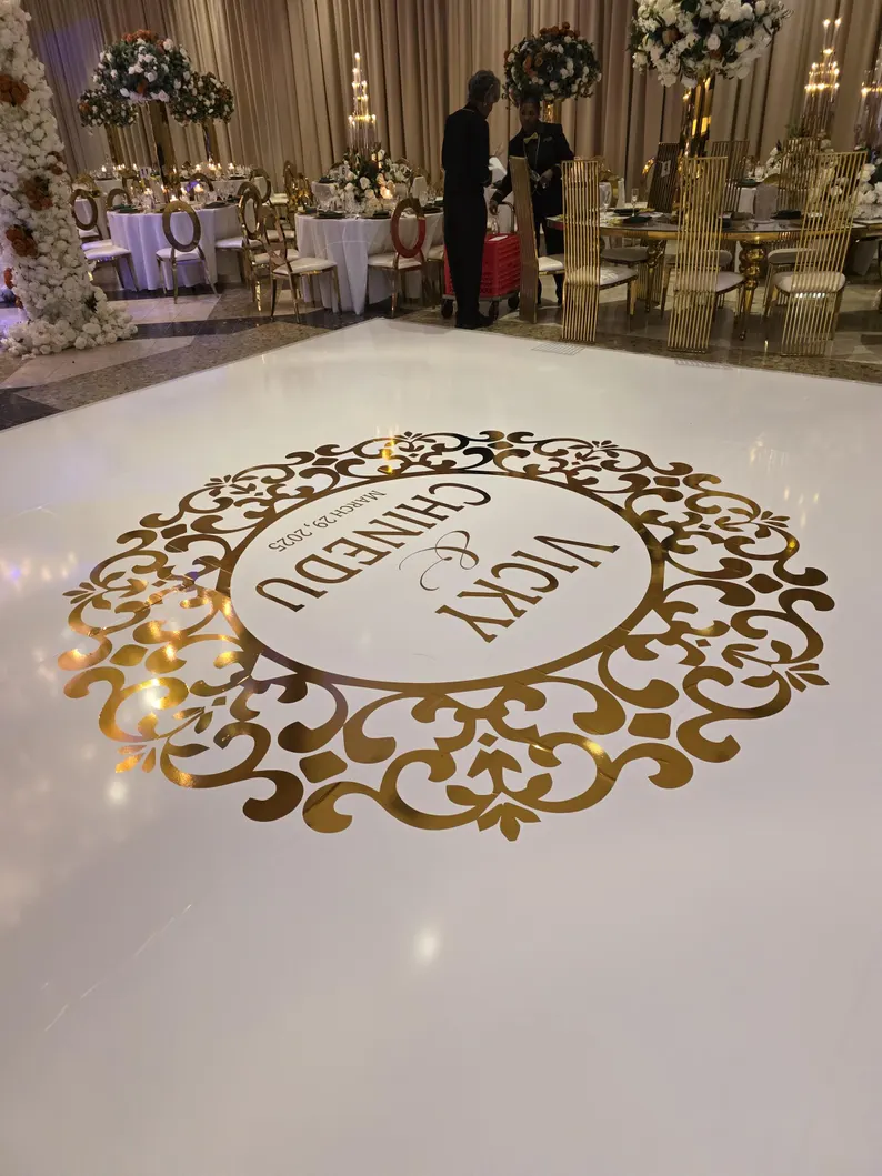Custom Decal Dance Floor Wrap Gloss White Removable Vinyl with Metallic Shiny Chrome Gold Foil Monogram Logo Design in Center for Wedding