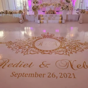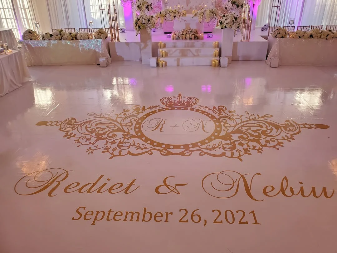 Custom Decal Dance Floor Wrap Gloss White Removable Vinyl with Printed Monogram Logo Design in The Center – Wedding Sticker Print Wrap